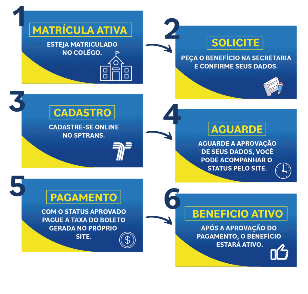 6. Benefício Ativo!: Após a confirmação do pagamento, o seu Bilhete Único (ou a revalidação do seu cartão já existente) estará ativo e pronto para ser carregado com o desconto de 50%. A primeira via do cartão, para novos solicitantes, será dada a opção para o estudante receber na sua residência ou retirar na escola.